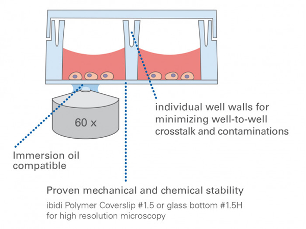 µ-Slide 8孔獨立高壁腔室載玻片,ibiTreat底部處理